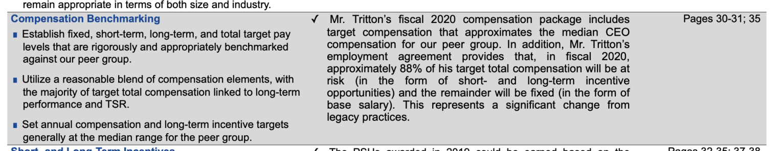 Unlike previous CEOs, Tritton decided to take his pay in 88% stock and stock options, which is a significant departure from past CEOs compensation structures. On the surface it looks like he's aligning with shareholders because his capital is "at risk" due to the stock price.