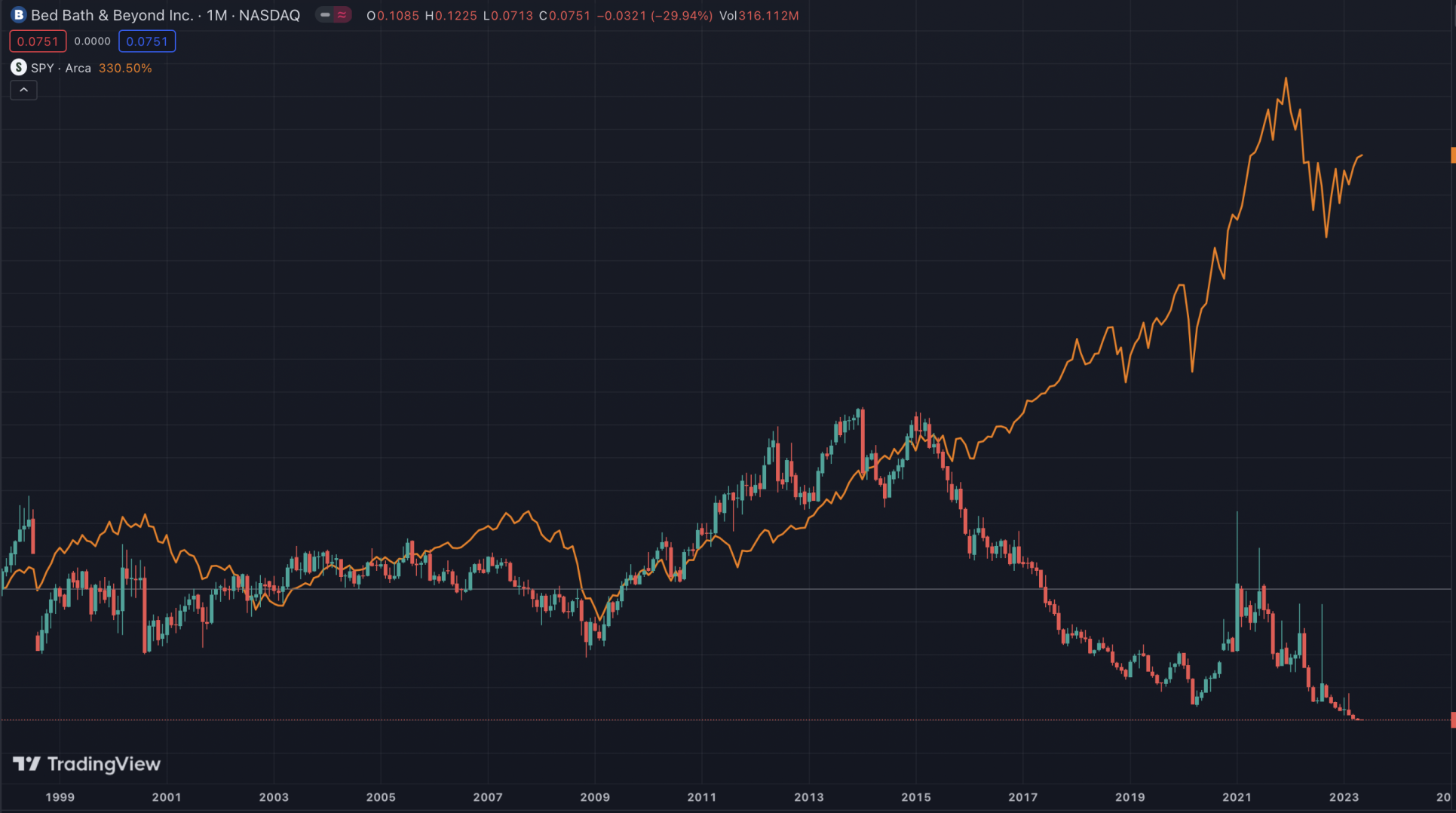 After 2008, the broad market went on an absolute tear. Bed Bath and Beyond went along for the ride,hitting all time highs in late 2013. Overall, BBBY followed the SPY until about mid 2015. After a textbook head and shoulders formed in 2015, the stock cratered for 3 years.