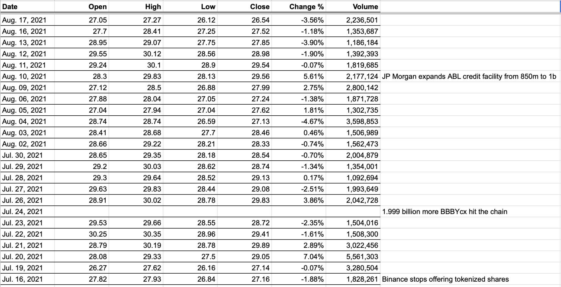 Immediately after the BBBYcx tokenized shares made their way onto the blockchain, the volume increases exponentially. This certainly lends to the idea these are being used in the traditional finance system to satisfy locates for real shares.