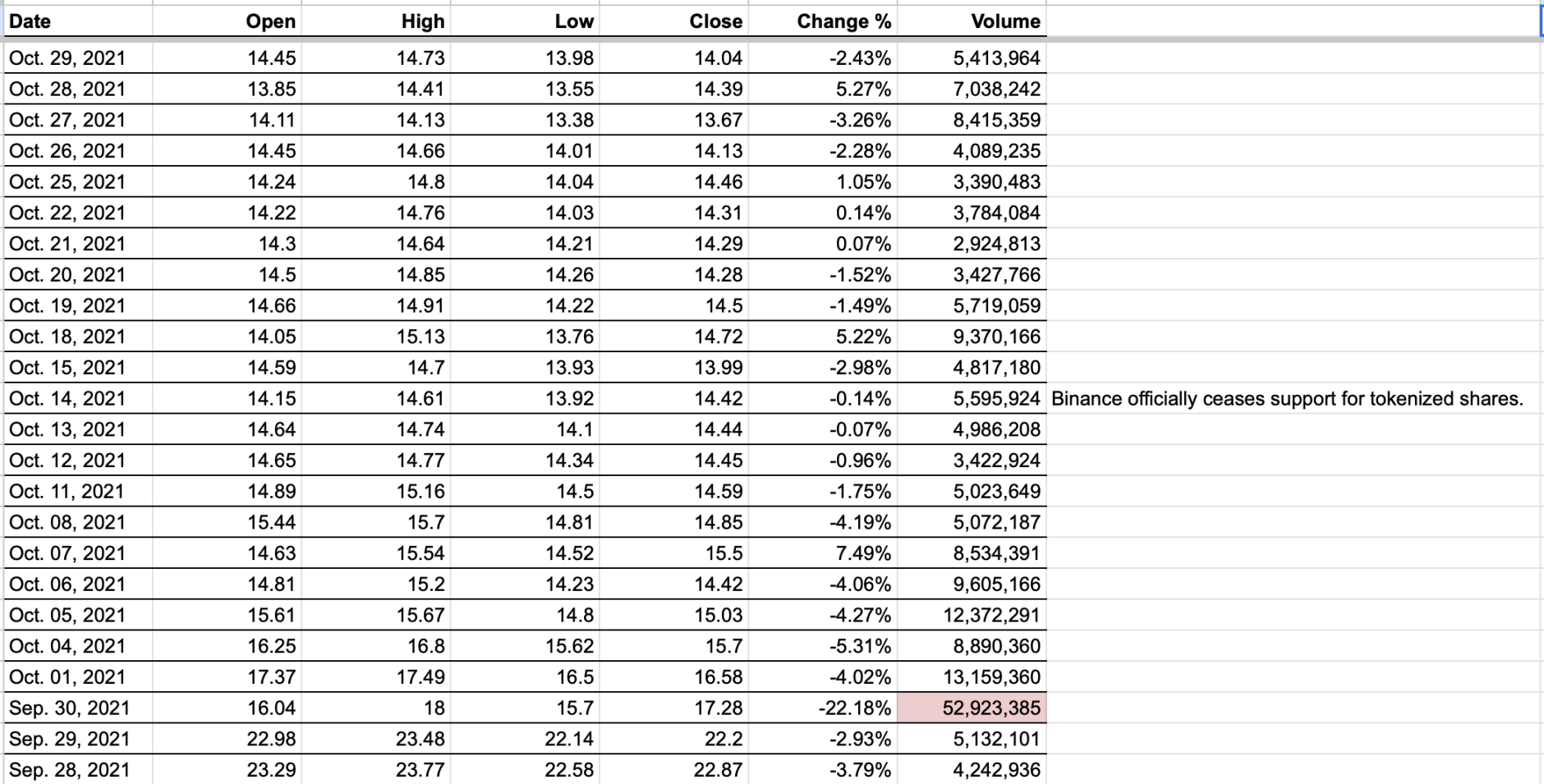 Binance's tokenized share program was abandoned after about a month, citing regulatory pressure. Pressure they knew was there going into it. However, the fact that it existed at all allowed them mint billions of tokenized shares for this stock and many others.