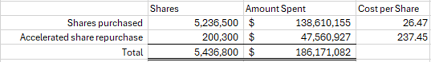 Interestingly, we know that 5,236,500 x $26.47 = $138,610,155 that was spent on share repurchases for the quarter that excluded the ASR shares, and we know that $186,171,082 was spent on all share repurchases for Q1 2021, so $186,171,082 - $138,610,155 = $47,560,927 was spent on the ASR.