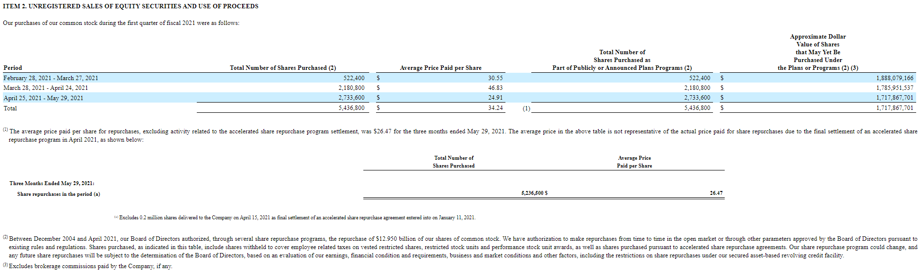 Per the 10-Q, “The average price paid per share for repurchases, excluding activity related to the accelerated share repurchase program settlement, was $26.47 for the three months ended May 29, 2021.”