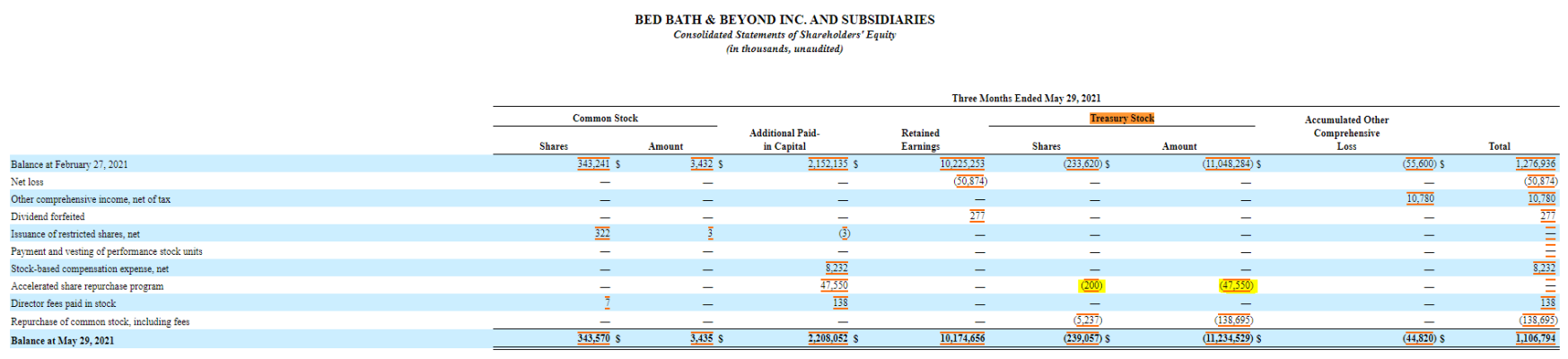 As the footnotes disclose, 5,436,800 shares were purchased by BBBY during Q1 2021, and 5,236,500, at an average price of $26.47, excluded activity related to the accelerated share repurchase program. That means the remaining 200,300 did, in fact, relate to the accelerated share repurchase program.