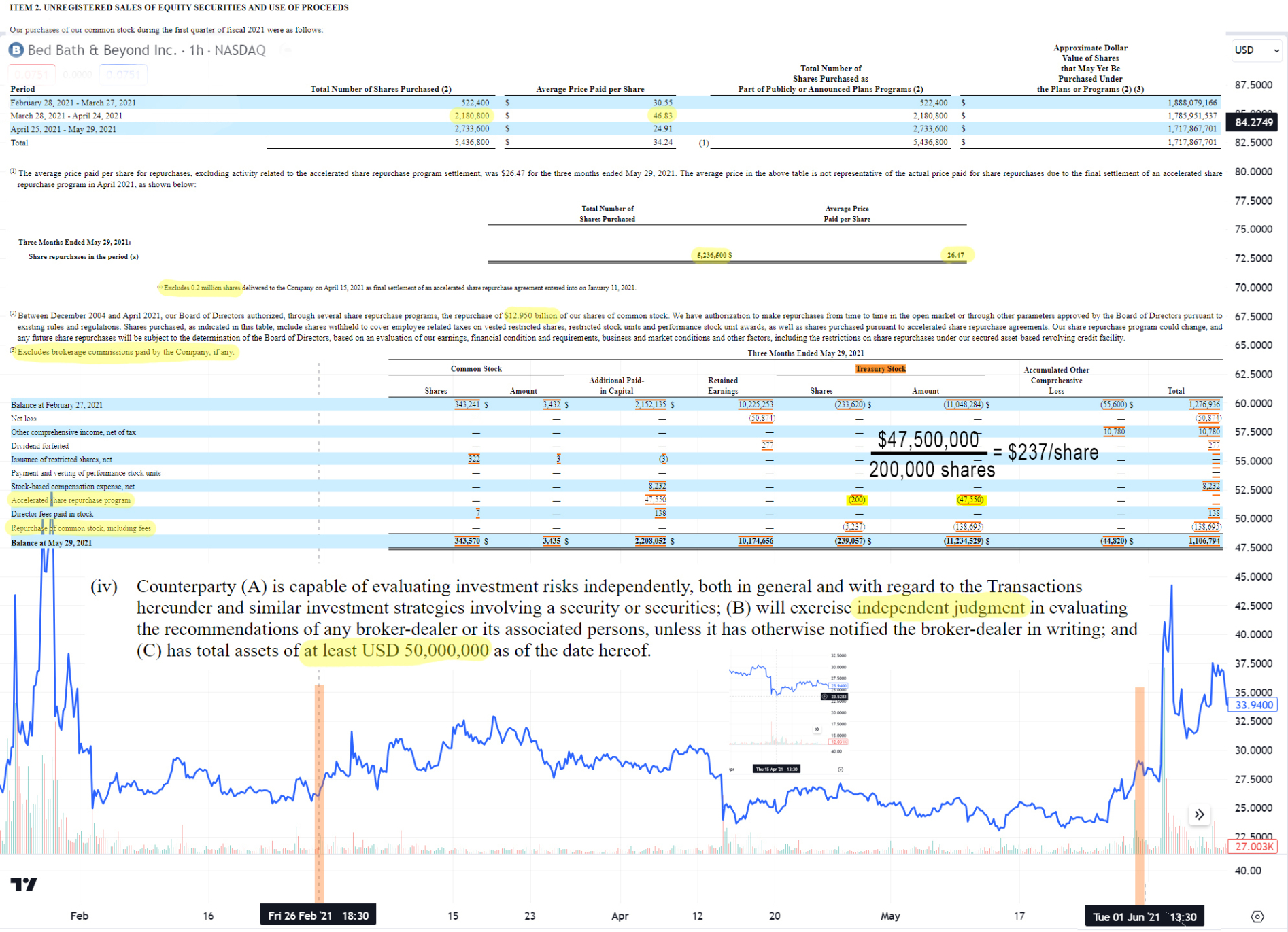 That $47,560,927 for the ASR shares which were delivered on April 25,2021 were for 200,300 shares, which mean that the cost per share in the ASR for BBBY was about $237 per share ($47,560,927 / 200,300). That price is more than about 1,000% higher than the average price paid per share on the open market, and the transaction cost shareholders approximately $42.2M in an ASR, that would have been ten times cheaper to purchase the shares on the open market.