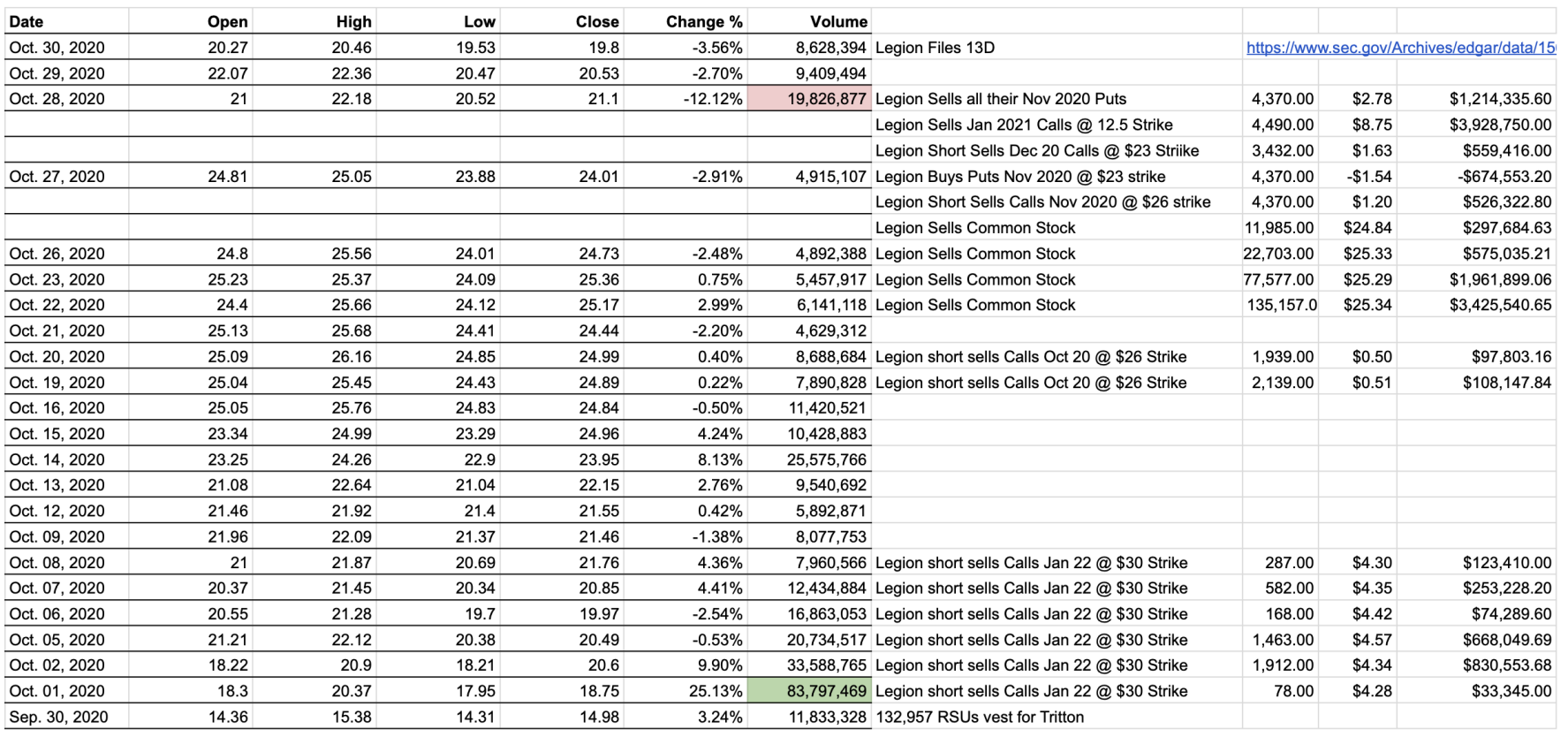 The day after Tritton's RSUs vest the stock goes up 25% on over 83 million volume. Throughout the month of October, Legion would trade this perfectly.