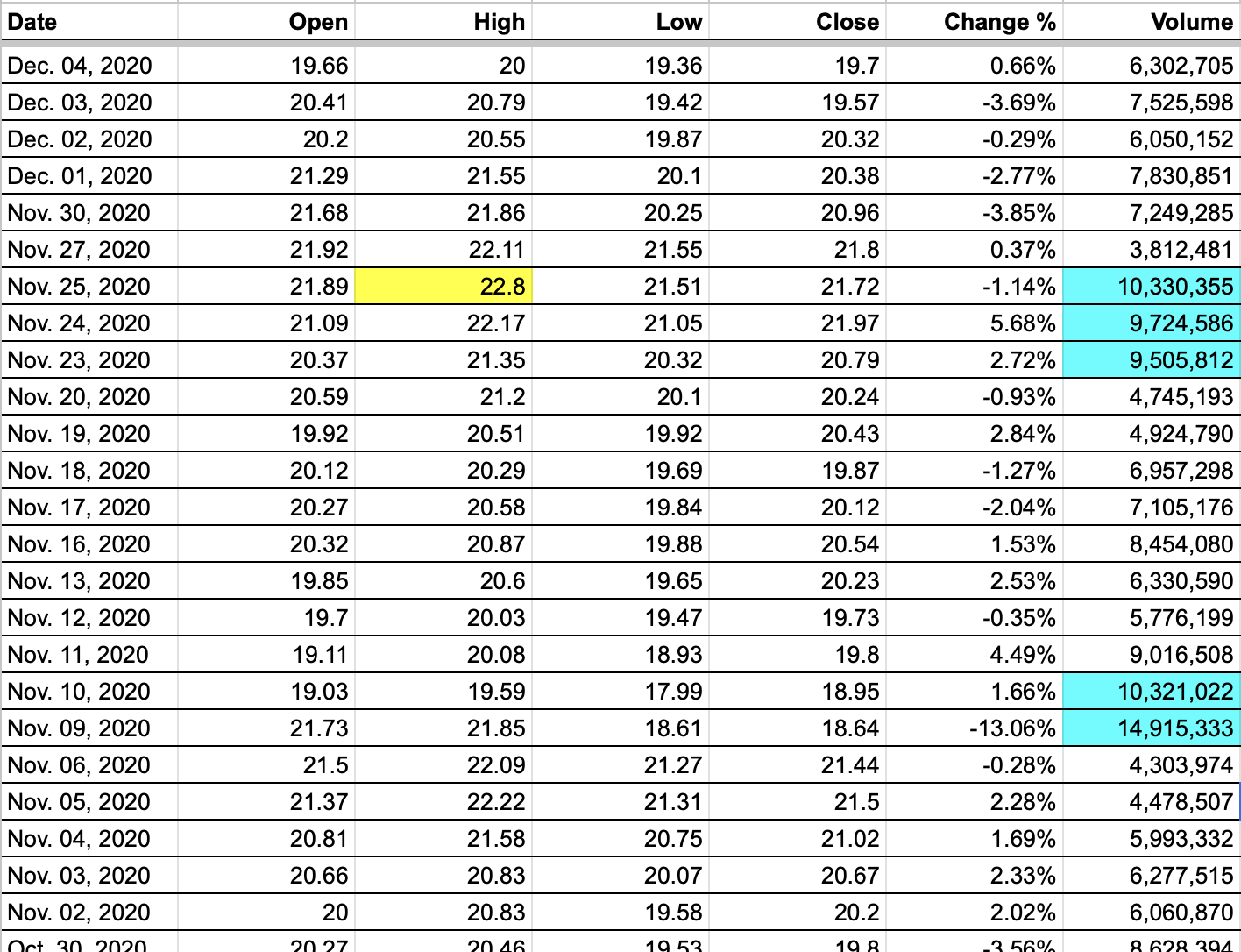 On Oct 28th, they finishes it all off by selling a bunch of December calls at a $23 strike. After this run, the stock only gets close to $23 around Nov 25th , at which point the volume spikes heavily and the price is suppressed.